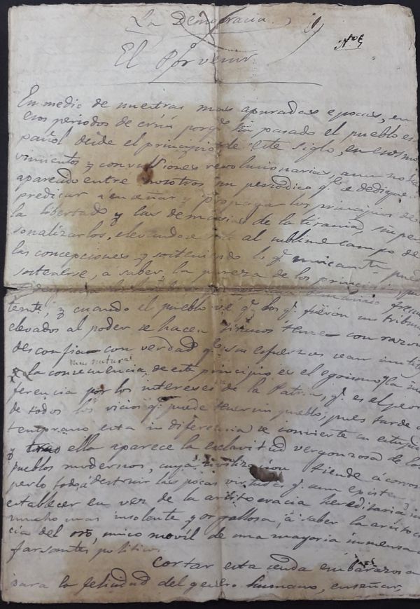 En medio de nuestras más apuradas épocas, en esos periodos de crisis porque ha pasado el pueblo español desde el principio de este siglo, en esos movimientos y convulsiones revolucionarias, aún no ha aparecido entre nosotros un periódico que se dedique a predicar, a enseñar y propagar los principios de la libertad y las demasías de la tiranía, sin personalizarlos, elevándose sólo al sublime campo de las concepciones y sosteniendo lo que únicamente puede sostenerse, a saber: la pureza de los principios, pero [por] desgracia los [hombres que avarician] demasiado frecuentemente, y cuando el pueblo ve que los que fueron sus tribunos elevados al poder se hacen tiranos teme con razón, desconfía con verdad que sus esfuerzos sean inútiles. La consecuencia más natural de este principio es el egoísmo y la indiferencia por los intereses de la Patria, que es el peor de todos los vicios que puede tener un pueblo, pues tarde o temprano esta indiferencia se convierte en estupidez y tras ella aparece la esclavitud vergonzosa de los pueblos modernos, cuya civilización tiende a corromperlo todo, a destruir las pocas virtudes que aún existen y a establecer en vez de la aristocracia hereditaria una mucho más insolente y orgullosa, a saber: la aristocracia del oro, único móvil de una mayoría inmensa de farsantes políticos.